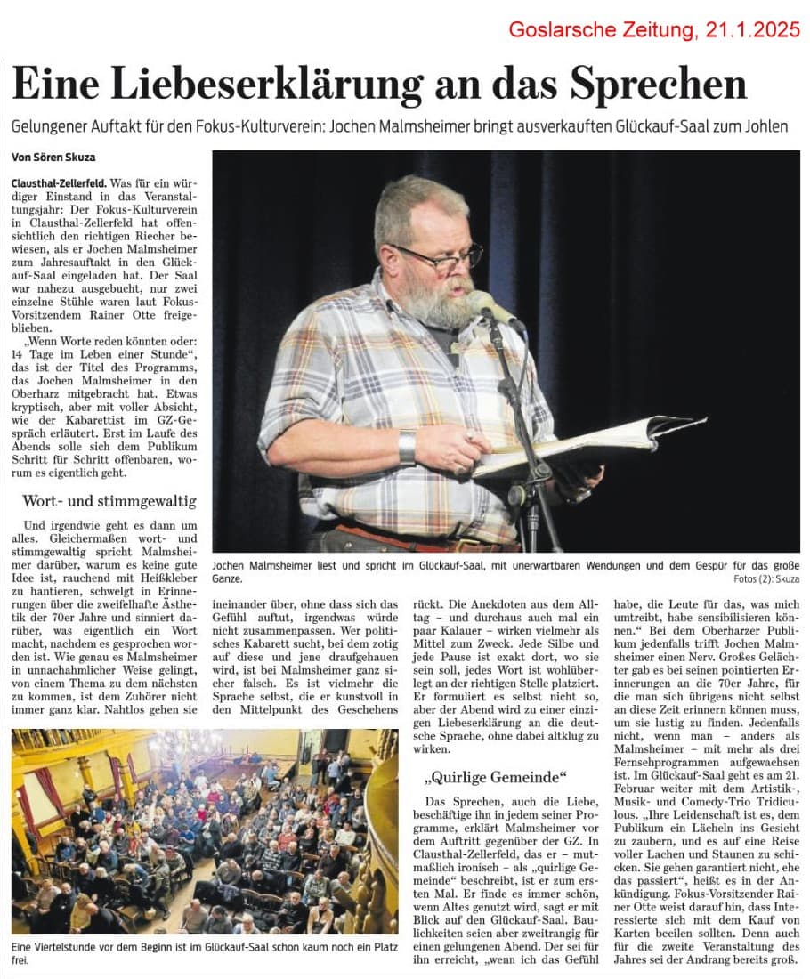 Die Goslarsche Zeitung berichtet in ihrer Ausgabe vom 21.1.2025 über den Abend.