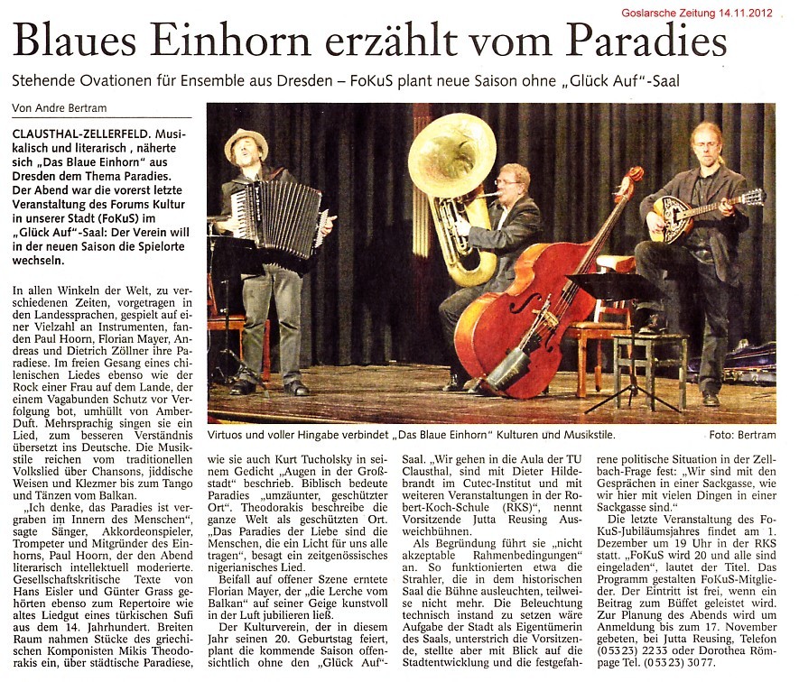 Archiv 2012 Sonnabend, 10. November 2012, 20.00 Uhr Glückauf-Saal, An der Marktkirche 7 Das blaue Einhorn - „Ankunft im Paradies“ |