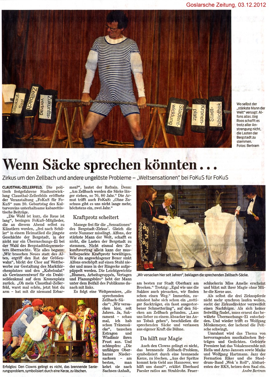 Archiv 2012 Sonnabend, 01. Dezember 2012, 19.00 Uhr Robert-Koch-Schule, Berliner Straße FoKuS wird 20 ... ... und alle sind eingeladen Wir feiern mit „FoKuS für FoKuS“ eine Veranstaltung, bei der FoKuS-Mitglieder das Programm gestalten mit lustigen, nachdenklichen, skurrilen und sonstigen Wort-, Tat- und Musikbeiträgen. Auch dieses Mal wird die Lokalpolitik ebenso aufs Korn genommen werden wie FoKuS selbst, das als Geburtstagskind im Mittelpunkt stehen wird. Natürlich muss man nicht Mitglied sein, um diesen heiteren Abend, der Akteuren wie Publikum unendlich viel Spaß macht, miterleben und mitfeiern zu dürfen. Sie möchten kommen? Dann zahlen Sie entweder einen Kostenbeitrag an der Abendkasse oder Sie beteiligen sich mit einem Beitrag für das anschließende Büffet. Damit wir planen können, melden Sie sich bitte an bis spätestens Samstag, 17. November bei Jutta Reusing oder Dorothea Römpage. Beiträge für das Büffet koordiniert Frau Römpage (Tel.: 3077). |