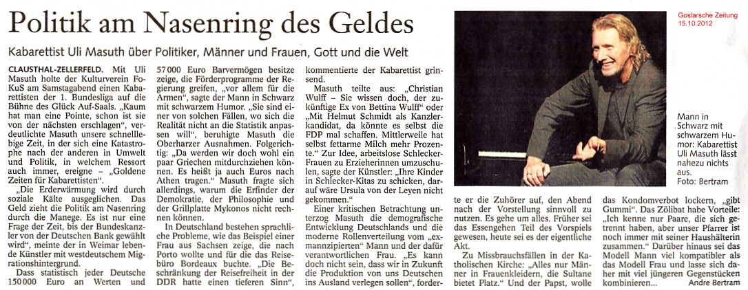 Er nutzt nicht nur den Degen "Ironie", sondern auch das mächtige Schwert "Sarkasmus", sein Stil ist ziel- und treffsicher, geistvoll und respektlos auf erstaunlich hohem Niveau. Uli Masuth ist Teilnehmer der 1. Kabarett Bundesliga. | |