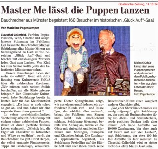 Archiv 2014 Sonnabend, 11. Oktober 2014, 20.00 Uhr Glückauf-Saal, An der Marktkirche 7 Master Me – Der Bauchredner Michael Schürmann mit neuem Programm Master Me präsentiert seine niveauvolle Bauchrednershow: Perfekte Technik -- ausdrucksstarke Puppen -- niveauvolle Unterhaltung -- individuelle Vorbereitung. Der Bauchredner Michael Schürkamp arbeitet mit zahlreichen Bauchrednerpuppen und haucht ihnen Leben ein. Jede Figur hat ihren eigenen Charakter. Wie schon bei unserem Kleinkunstfest 2013 wird er uns mit ihnen zum Lachen bringen. ![]() Da sind: Opa Oskar, der Nörgler Horst Herpes, der Finanzexperte ohne Fachwissen Igor, der wirklich alles verkauft Elvira, die jung gebliebene Rentnerin mit schlechter Gesangsausbildung Enrico, der mafiöse Italiener Ganz wichtig: Es gibt keine Anzüglichkeiten! Stattdessen: Wortwitz, Esprit, fantasievolle Figuren. |