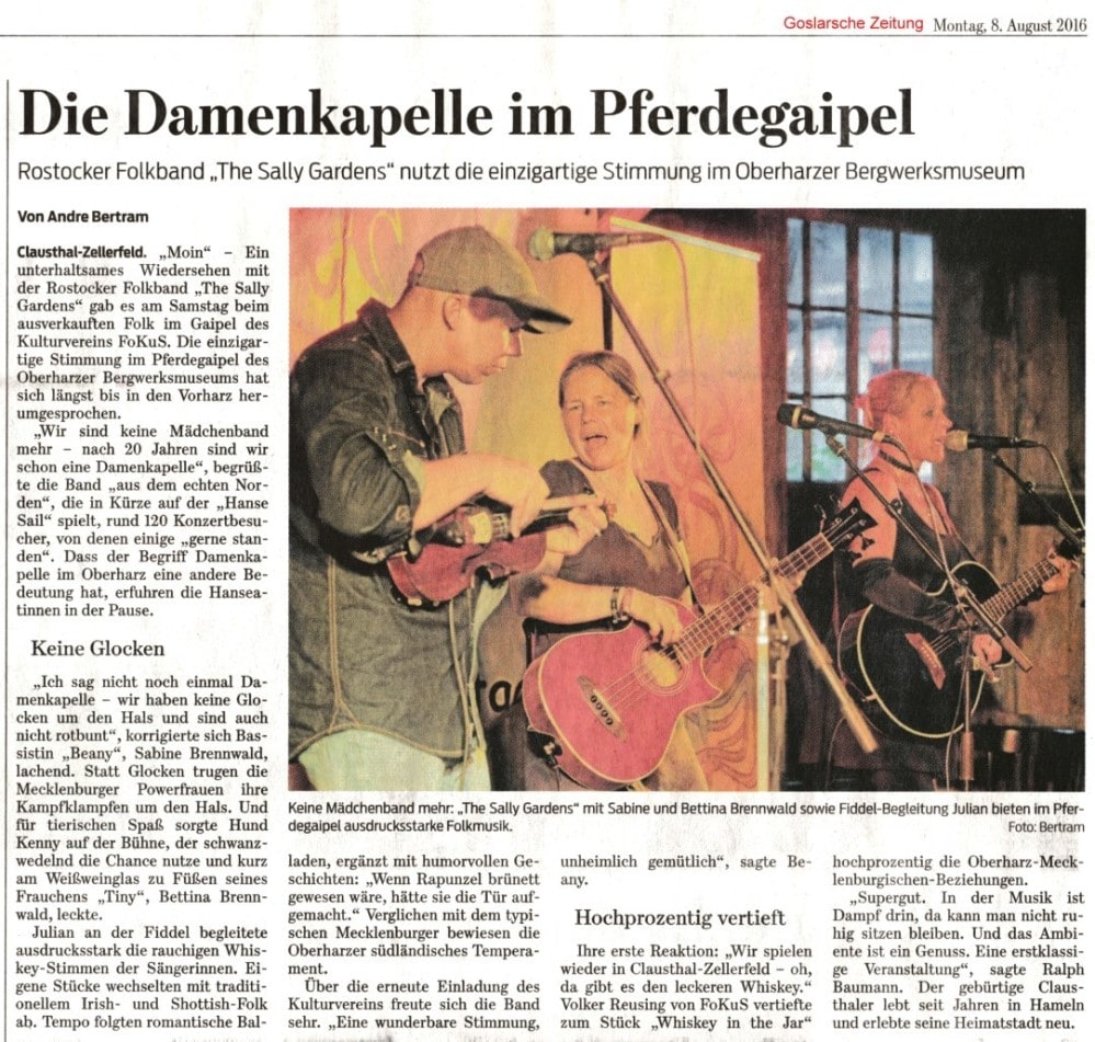 "The Sally Gardens" aus Rostock ist eine Band, die noch großen Wert auf handgemachte Musik legt. Nur ausgestattet mit Gitarre, Fiddle, Bass, Mandoline und Bodhran, dafür aber mit unglaublichen "Whiskey"-Stimmen bewaffnet, spielen die zwei blonden Ladies mit verschiedenen Gastmusikern in beinahe jedem Pub, der ihren Weg kreuzt sowie auf Kon¬zerten und Festivals in ganz Deutschland und in Teilen Englands.