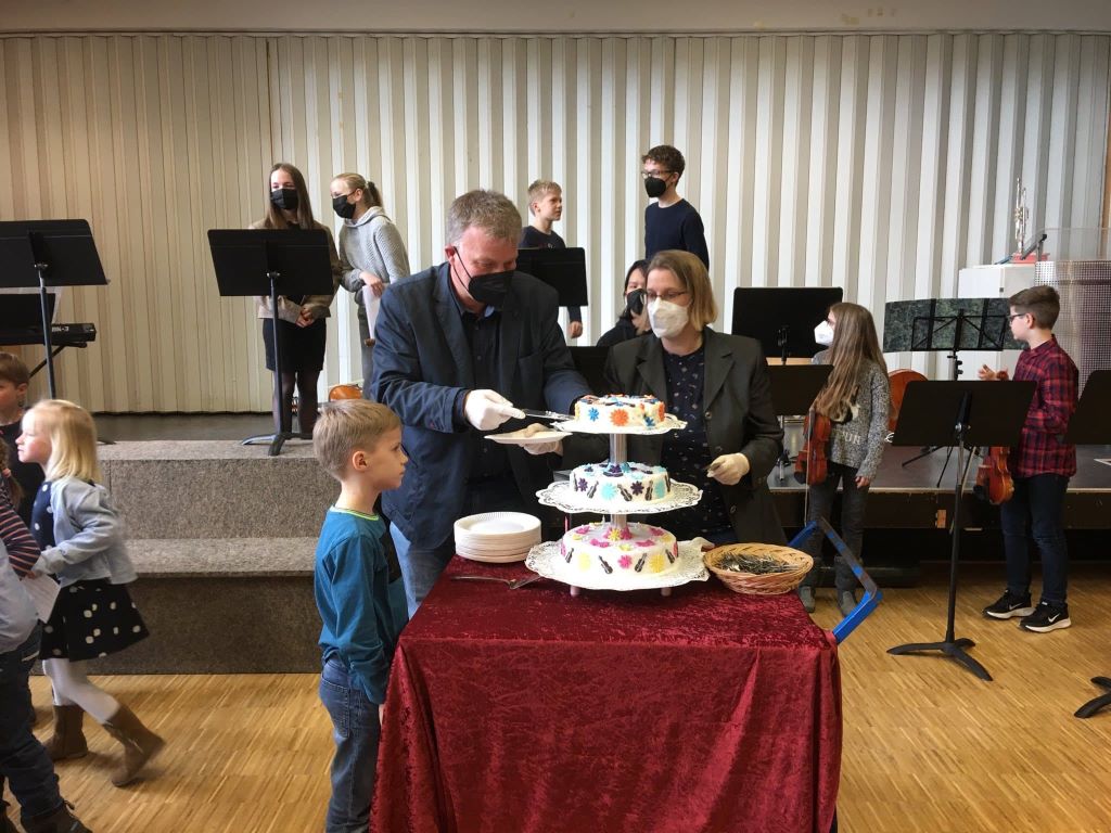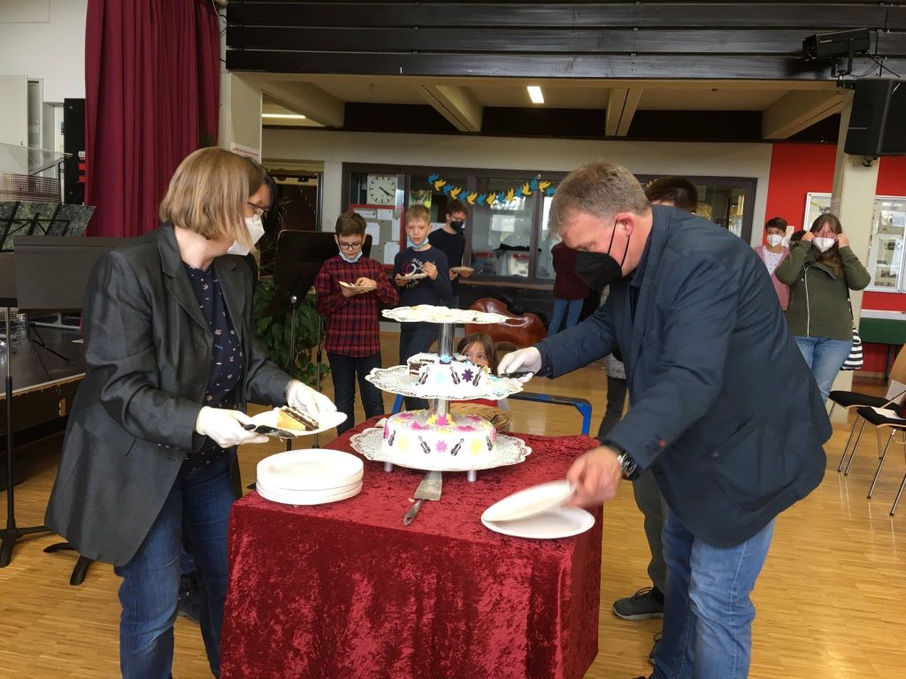 Die beiden Hauptverantwortlichen schneiden zum Abschluss die von Bäckerei Biel gestiftete Geburtstagstorte an.