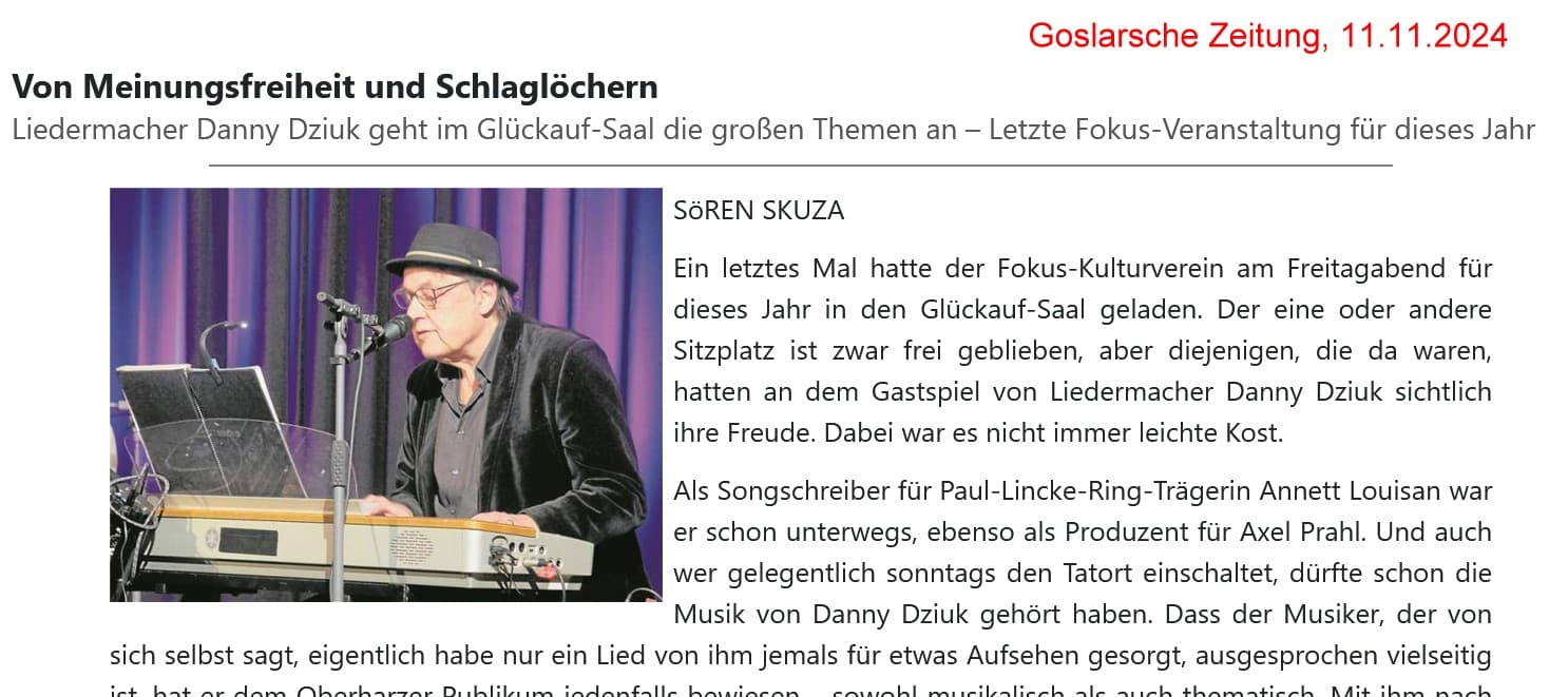 Danny Dziuk schreibt deutschsprachige Songs, Chansons und manchmal auch Lieder, die er meistens auch selber singt, spielt oder produziert - ob nun mit oder ohne Band.