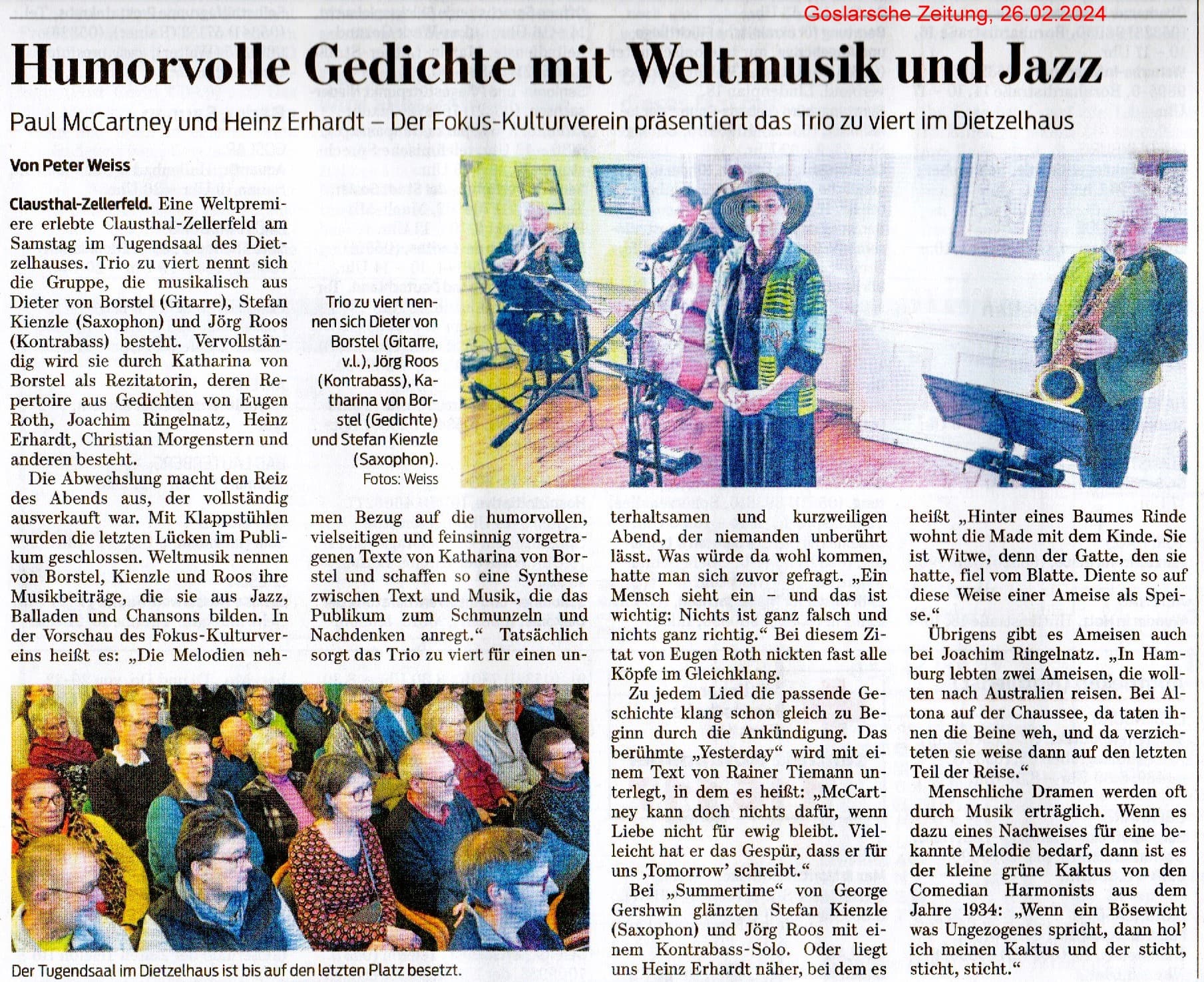 Trio zu viert: Humorvolle Gedichte mit Weltmusik und Jazz in „Jazz und Lyrik“.Das neugegründete Quartett „Trio zu viert“ präsentiert sein humorvolles Programm „Jazz und Lyrik“ mit Gedichten von Eugen Roth, Ringelnatz, Heinz Erhard, Christian Morgenstern und anderen. Die Gedichte werden instrumental umrahmt von Dieter von Borstel (Gitarre), Stefan Kienzle (Saxophon) und Jörg Roos (Kontrabass) mit Stücken aus Jazz, mit Balladen, Chansons und Weltmusik; sie nehmen Bezug auf die humorvollen, vielseitigen und feinsinnig vorgetragenen Texte von Katharina von Borstel und schaffen so eine Synthese zwischen Text und Musik, die das Publikum zum Schmunzeln und Nachdenken anregt.